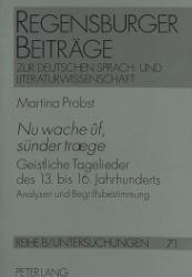 Geistliche Tagelieder des 13. bis 16. Jahrhunderts. Analysen und Begriffsbestimmung. Ein geistliches Tagelied ist - nach den Kriterien von Theodor Kochs (1928) - bereits als solches definiert, wenn es ein einziges Motiv aufweist, welches dem weltlichen Tagelied entnommen ist. In dieser Studie wird die elementare Struktur des profanen Typus zum Orientierungspunkt, die Perspektive ändert sich für die ausführlichen Betrachtungen ausgewählter Lieder. Die aus dem weltlichen Pendant übernommenen bestimmenden Elemente illustrieren nicht nur die geistliche Version, sie zeigen auch die Vielfalt an Varianten innerhalb dieser Variationsform und charakterisieren diese mittels ihrer Relation und Relevanz. Die Tagelieder werden mit Blick auf die Zeitphasen erörtert, mit Schwerpunkt auf inhaltlich-stilistischer Interpretation. 186 Seiten, broschiert (Regensburger Beiträge zur deutschen Sprach- und Literaturwissenschaft. Reihe B: Untersuchungen; Band 71/Peter Lang Verlag 1999) Mängelexemplar